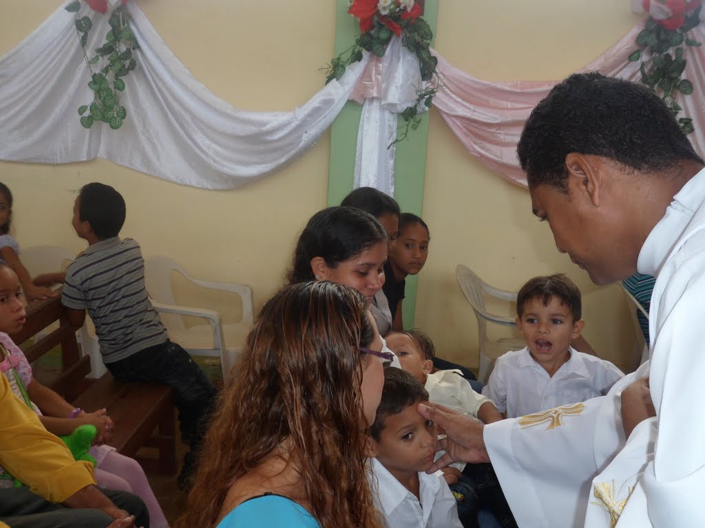 Neste sentido o padre Maribelton realizou o batizado de 13 crianças neste sábado, dia 07, pela manhã. O ritual teve início às 8 horas da manhã e logo após foi servido um humilde lanche no Salão Paroquial para comemorar tão importante realização na vida daquelas famílias.